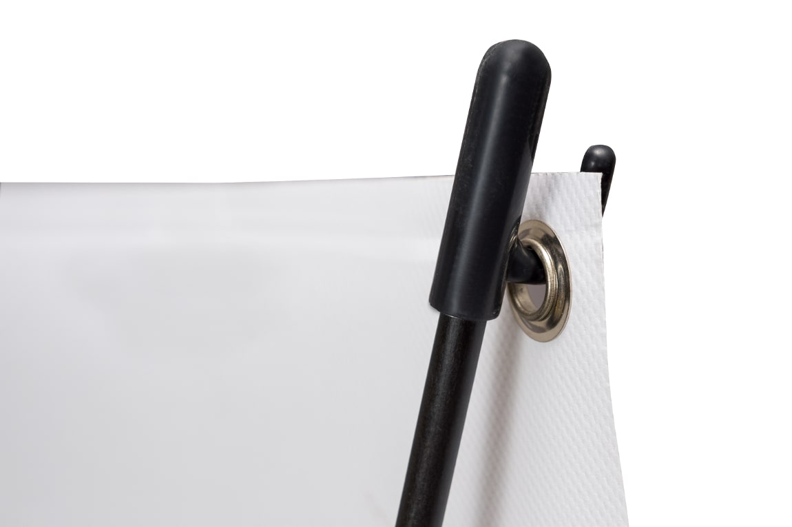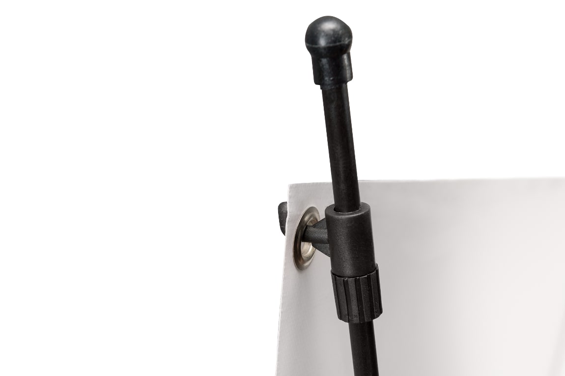 - Błyskawiczny aranż: System zakładania grafiki na stelaż jest intuicyjny i higieniczny – po prostu zaczepiasz baner z oczkami na ramionach stojaka. Gotowe w minutę!